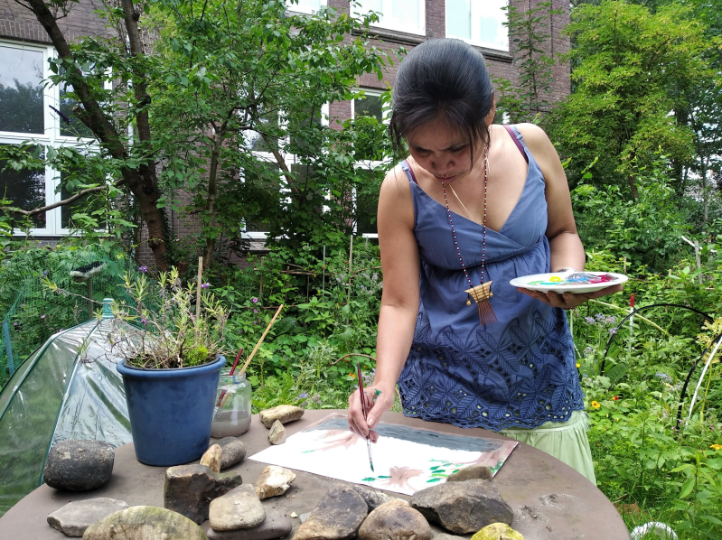Toni schilderde een open plek tussen de bomen waar een huis gebouwd kan worden. De kinderen mogen boomhutten bouwen en in de bomen klimmen. Op de voorgrond groeien bloemen in het gras. Daar kun je bloemen plukken of voetballen. Toni heeft ervaring met getraumatiseerde kinderen en wil er graag paar dagdelen vrijwilligerswerk komen doen.